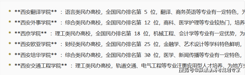 西安交通大学、西北工业大学、西北农林科技大学、西安电子科技大学、西北大学、陕西师范大学、长安大学。这是陕西的几所985或211工程院校,实力摆正在那,因为陕西地处西北,所以分数线相对于沿海地域或经济强市要低一些,这也给大师报考陕西的院校供给了优良机遇,绝对是最佳选择。西安理工大学、西安邮电大学、西北大学、西安建建科技大学、陕西科技大学、西安科技大学、西安外国语大学。这些院校也都是老牌大学,实力雄厚、师资力量强大、硬件设备齐备,有浩繁的博士硕士授权点和国度特色专业及省级沉点学科,是你报考的抱负选择。西安石油大学、西安工业大学、西安财经大学、西安医学院、陕西西医药大学。这几所院校实力也相可不雅,师资力量强大,人才辈出,学校有双聘院士、出名学者、特级传授,有国度特色专业及省级沉点学科,是你肄业的优良选择。西安工程大学、延安大学、陕西理工大学、西安医学院、西安航空学院、西安美术学院、西安体育学院。这几所院校都是通俗本科院校,建校汗青长久、学风浓重,有浩繁的学位授权点和国度特色专业及省级沉点学科,正在此深制,你的将来不是梦。宝鸡文理学院、西安文理学院、榆林学院、咸阳师范学院、安康学院、渭南师范学院、商洛学院、陕前师范学院、西京学院、西安培华学院、西安交通大学城市学院、西安翻译学院、西安欧亚学院、西安思源学院、西安交通工程学院、西安科技大学高新学院、西安财经大学行知学院、陕西国际商贸学院、西安建建科技大学华清学院、延安大学西安立异学院、陕西服拆工程学院、西北工业大学北方消息工程学院、陕西科技大学镐京学院、西北工业大学明德学院、长安大学兴华学院、西安消息职业大学、西安外事学院、西北大学现代学院、西安理工大学高科学院。这些院校实力相对偏弱,但完全能够实现你读本科的胡想,只需你肯勤奋,考研就业都没有问题,你的将来会一片。西安交通大学:分析类名校,全国排名第 12 位,C9 联盟 / 双一流 / 985 高校,能源动力、机械工程等学科处于顶尖程度,为国度科研和人才培育做出了杰出贡献。西北工业大学:理工类名校,全国排名第 25 位,双一流 / 985 高校,航空宇航、材料科学等学科全国领先,是我国国防科技工业的主要人才培育。西安电子科技大学 :理工类高校,全国排名第 38 位,双一流 / 211 高校,消息取通信工程、计较机科学等学科实力强劲,正在电子消息范畴具有普遍影响力。西北农林科技大学:农林类高校,全国排名第 54 位,双一流 / 985 高校,农业科学、葡萄酒工程等学科特色明显,为我国农业和农村成长培育了大量专业人才。陕西师范大学:师范类高校,全国排名第 68 位,双一流 / 211 高校,教育学、中国言语文学等学科劣势较着,为处所根本教育输送了大量优良师资。长安大学:理工类高校,全国排名第 85 位,双一流 / 211 高校,交通运输工程、土木匠程等学科实力雄厚,为我邦交通范畴培育了大量专业人才。空军军医大学:医药类高校,全国排名第 90 位,211 高校,原第四军医大学,临床医学、口腔医学等学科处于顶尖程度,为我事医学和医疗卫生事业培育了大量专业人才。西北大学:分析类高校,全国排名第 64 位,具有双一流学科,考古学、地质学等学科正在全国名列前茅,为处所经济社会成长输送了大量复合型人才。西安建建科技大学:理工类高校,全国排名第 120 位,“建建老八校” 之一,土木匠程、城乡规划等学科特色明显,为建建行业培育了大量专业人才。西安理工大学:理工类高校,全国排名第 135 位,水利工程、印刷工程等学科劣势凸起,为处所制制业和工程手艺范畴输送了大量人才。陕西科技大学:理工类高校,全国排名第 150 位,轻工手艺取工程、皮革化学等学科有必然特色,为相关财产培育了大量专业手艺人才。西安邮电大学:理工类高校,全国排名第 180 位,消息取通信工程、收集平安等学科有必然劣势,为处所消息财产培育了大量人才。西安外国语大学:言语类高校,全国排名第 190 位,日语、俄语等学科正在全国排名靠前,为外事、经贸等范畴培育了大量外语人才。西安美术学院:艺术类高校,做为中国八大美院之一,美术学、设想学等学科实力强劲,为文化艺术财产培育了大量专业人才。西安音乐学院:艺术类高校,全国音乐类排名前五,正在音乐表演、做曲等范畴有必然影响力,为音乐艺术范畴培育了大量专业人才。西安石油大学:理工类高校,石油工程、地质资本等学科特色明显,为石油行业培育了大量专业手艺人才。西安工程大学:理工类高校,纺织工程、服拆设想等学科有必然劣势,为纺织服拆行业培育了大量专业人才。