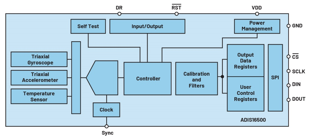 ADIS16500是一款细密微型机电系统(MEMS) IMU,内置一个三轴陀螺仪、一个三轴加快度计和一个温度传感器。拜见图2。该IMU的活络度、偏置、瞄准、线性加快度(陀螺仪偏置)和坐标轴原点(加快度计)已正在工场校准。这意味着正在各类前提下都能供给切确的传感器丈量。