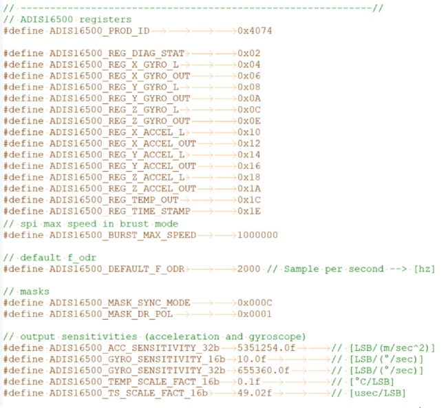 附录中的图3显示了包罗adis16500。h正在内的每个模块均可利用的所有公共变量和公共类型声明,此中定义了新的类型,例如,ADIS16500_XL_OUT类型被定义为包含三个浮点的布局,每个轴(x、y和z)一个浮点。此外,还通过列举来支撑分歧的传感器设置装备摆设,使设想人员可以或许矫捷地选择合适本身需求的设置装备摆设。最值得关心的是使驱动法式取硬件无关的部门。正在公共变量部门的开首(附录中的图3),有三个环节的类型定义:指向三个根基函数的指针,或者SPI发送和领受函数,以及为生成准确的停转时间,两次SPI拜候之间所需的延迟函数。这些代码还显示了可指向的函数的原型。SPI发送函数将指向待发送值的指针做为输入,然后前往可供查抄的内容,以确定发送能否成功。SPI领受函数也是如斯,该函数将指向变量的指针做为输入,这个指针将存储领受时读取的值。延迟函数以浮点数做为输入,暗示设想人员想要期待的微秒数,不前往任何内容(void)。通过这种体例,设想人员能够正在使用层(例如正在main文件中)操纵这些特定的原型来声明这三个函数。声明后,他们能够将这三个函数赋值给ADIS16500_INIT私有布局的字段。附录中的图2列举了一个示例,以帮帮更好地舆解最初一步。