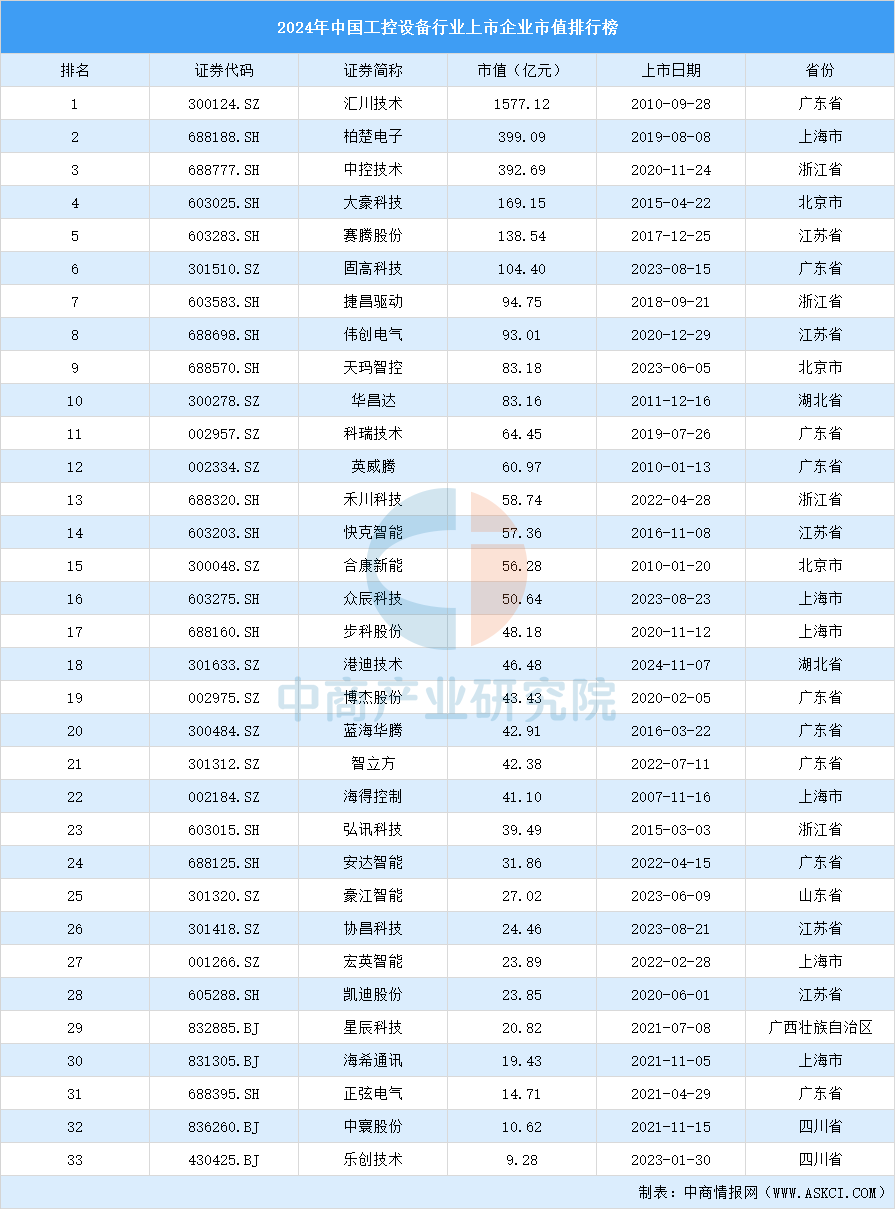 中商谍报网讯:中商财产研究院数据库显示,2024年中国工控设备行业市值最大的十名上市企业别离是汇川手艺、柏楚电子、中控手艺、大豪科技、固高科技、捷昌驱动、伟创电气。